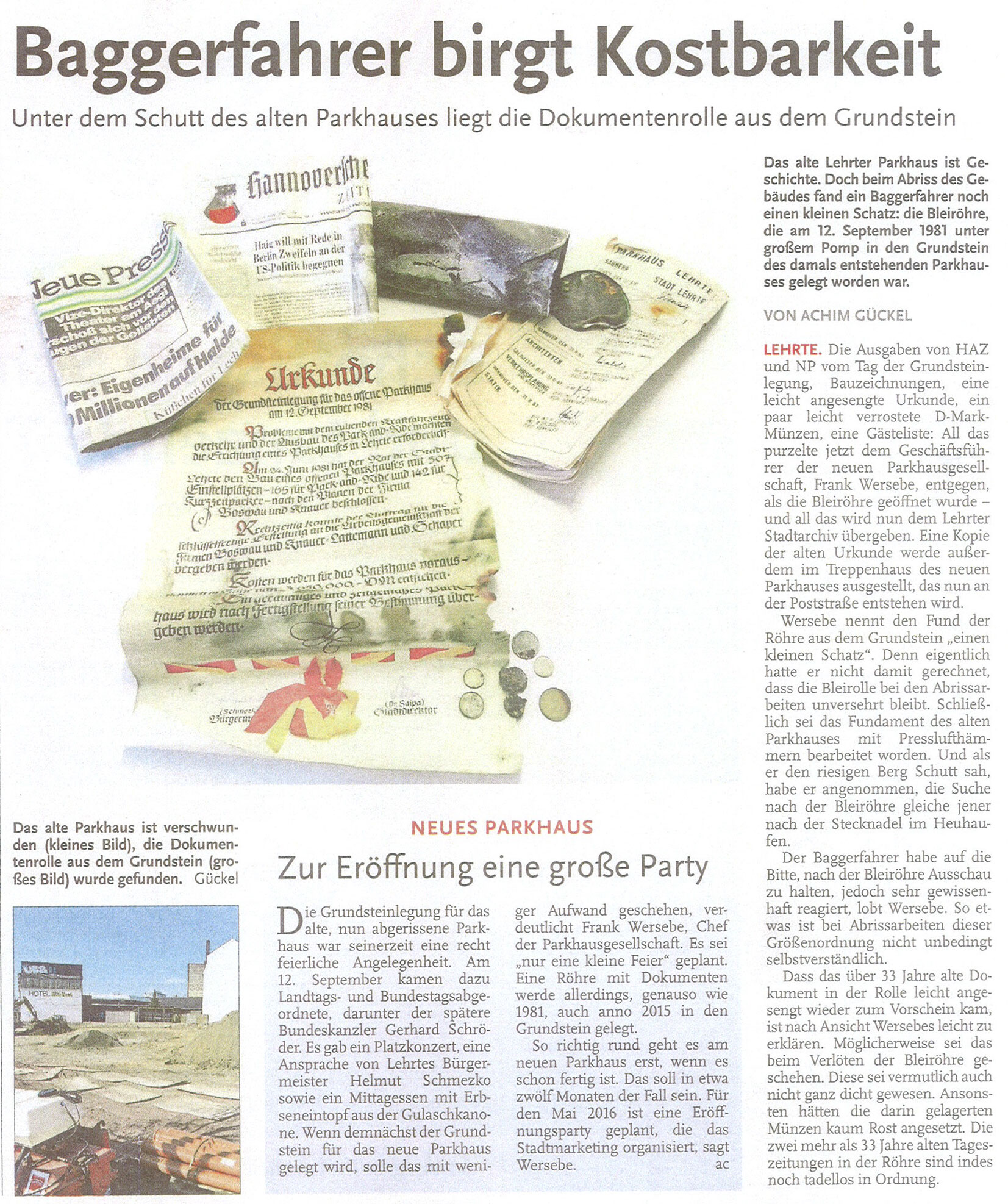 Anzeiger 16.04.2015 - Baggerfahrer birgt Kostbarkeit Bei den Abrissarbeiten wird die Dokumentenrolle gefunden, die damals beim Bau des ehemaligen Parkhauses vergraben worden war! 2015-04-16-Baggerfahrer-birgt-Kostbarkei[...] JPG-Datei [799.0 KB]