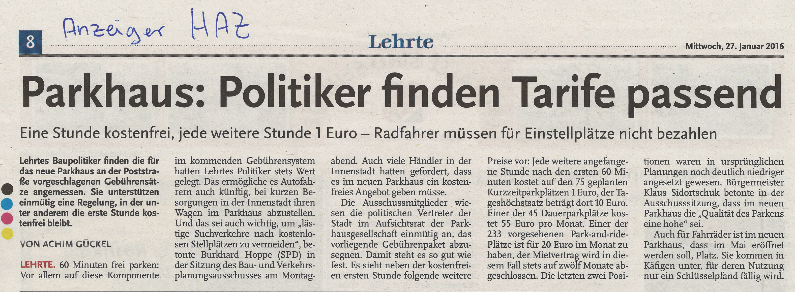 Anzeiger 27.01.2015 - Poltiker finden Tarife passend Erste Stunde kostenfrei, jede weitere Stunde kostet 1 Euro - Radfahrer können ihr Rad gratis abstellen Anzeiger-Lehrte-27.01.2016.jpg JPG-Datei [957.6 KB]