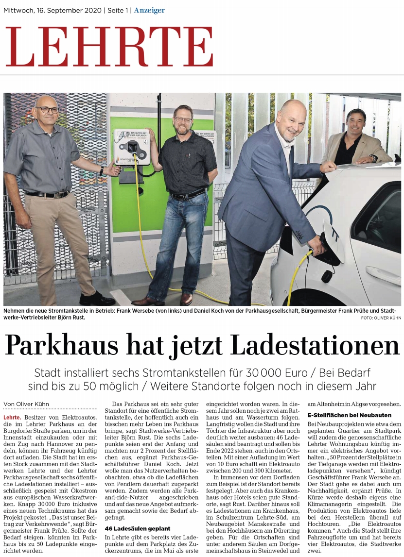Parkhaus hat jetzt Ladestationen Stadt installiert sechs Stromtankstellen im Parkhaus HAZ 16.09.2020 Lehrte-Sehnde.jpg JPG-Datei [778.8 KB]